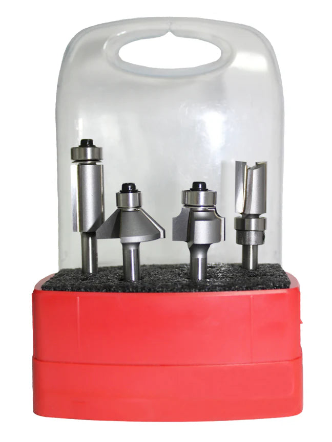 A convenient starter set made up of four popular router bits all in a 1/4" shank. Works well in compact routers or laminate trimmers. The set includes a Template Bit, 45° Chamfer Bit, 1/8" Roundover Bit, and Flush Trim Bit. This selection is designed to be compatible with the smaller base plate holes found in compact routers.