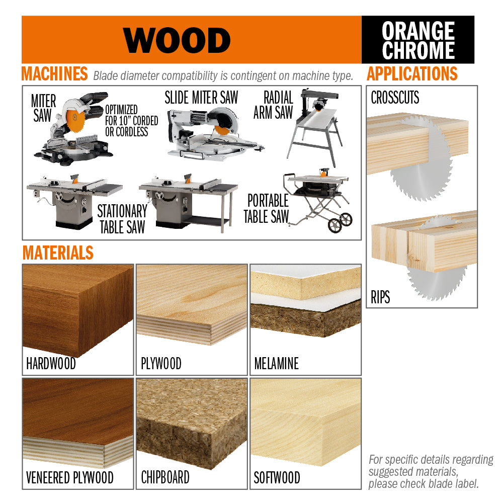 Applications: General purpose ripping and crosscutting of hardwood, softwood, plywood, melamine, and MDF